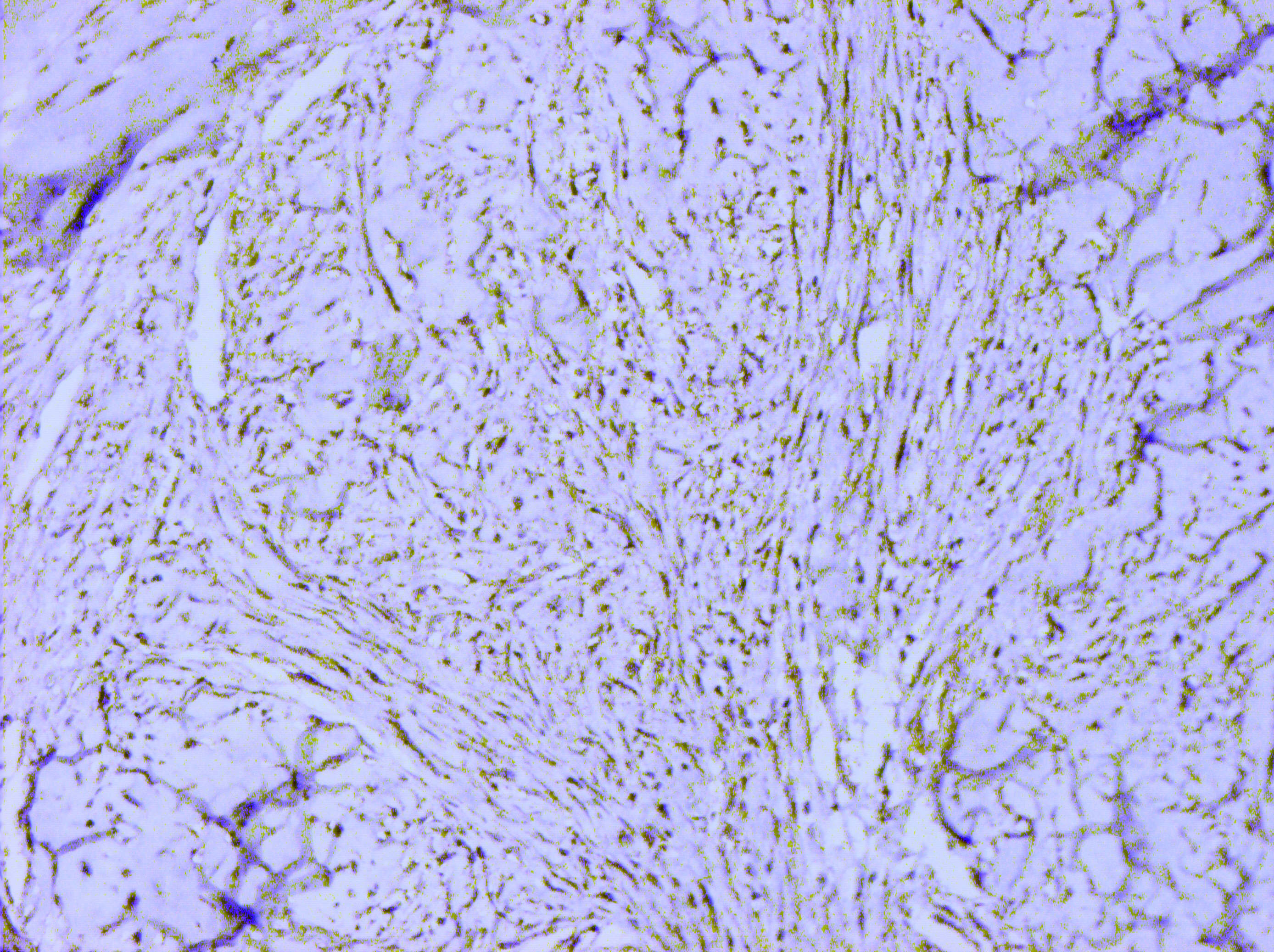 Результати дослідження та їх обговорення. Після проведених імуногістохімічних досліджень виявилось, що із 12 сарком без уточненого гістотипу в 9 випадках були плеоморфні саркоми, у 2-х – міофібробластні саркоми, та одна остеосаркома. Із 27 блоків ангіосарком імуногістохімічно було підтверджено 17 (63,0 %), інші 10 (37,0 %) виявились карциномами. Фібросаркоми (три гістологічні блоки) були повністю підтверджені імуногістохімічно. Серед 18 гістологічних блоків філоїдних пухлин проміжного типу у двох випадках (11,1 %) було встановлено злоякісний варіант ФП.