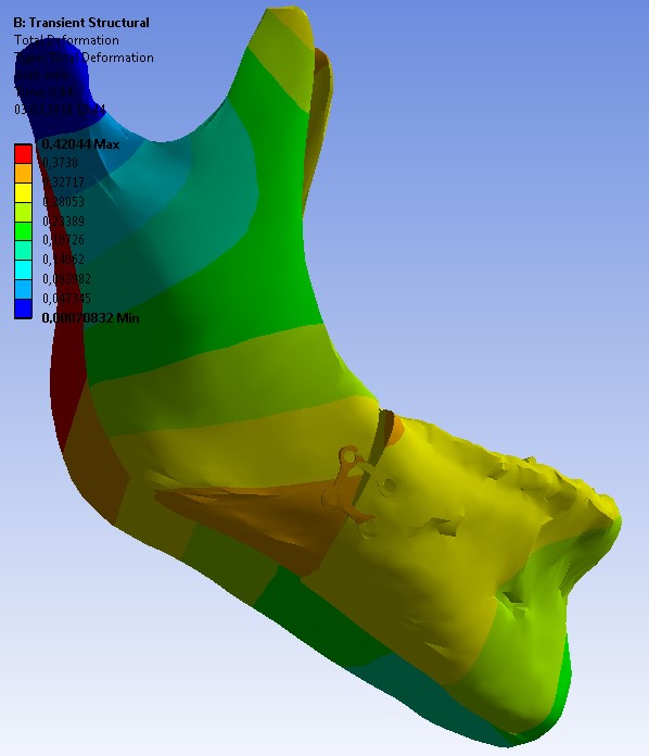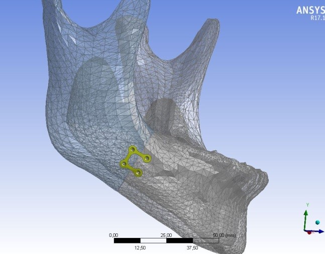 Materials and Methods. To determine the optimal configuration of the plate not only the value of the pressure and plate area were used but also the relative displacement of the mandible fractures. A computer tomography was used to obtain a three-dimensional computational model, which was exported to the Ansys Workbench software suite.