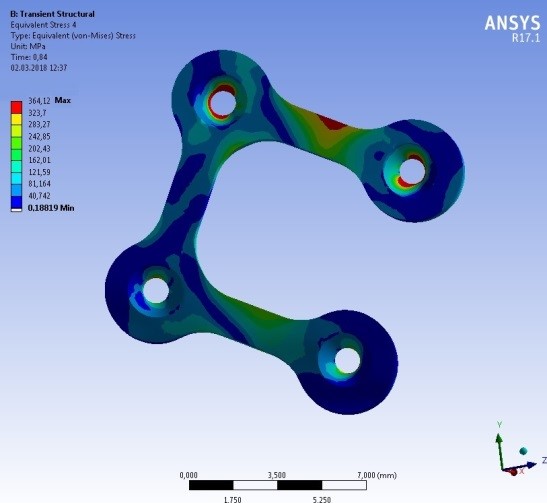 Results and Discussion. As a result of our research, we found that in the osteosynthesis of the angular mandible fracture accomplished with our π-plate, the largest displacement of the fragments relative to each other was 0.14 mm. That means this plate provides reliable fixation of fragments. The greatest pressure that arose in the π-plate was 364 MPa. This pressure is less than the yield point therefore when the load is removed the plate returns to its original position. It should be noted that the installation of the plate in the other direction gives an excess of the material’s yield point.