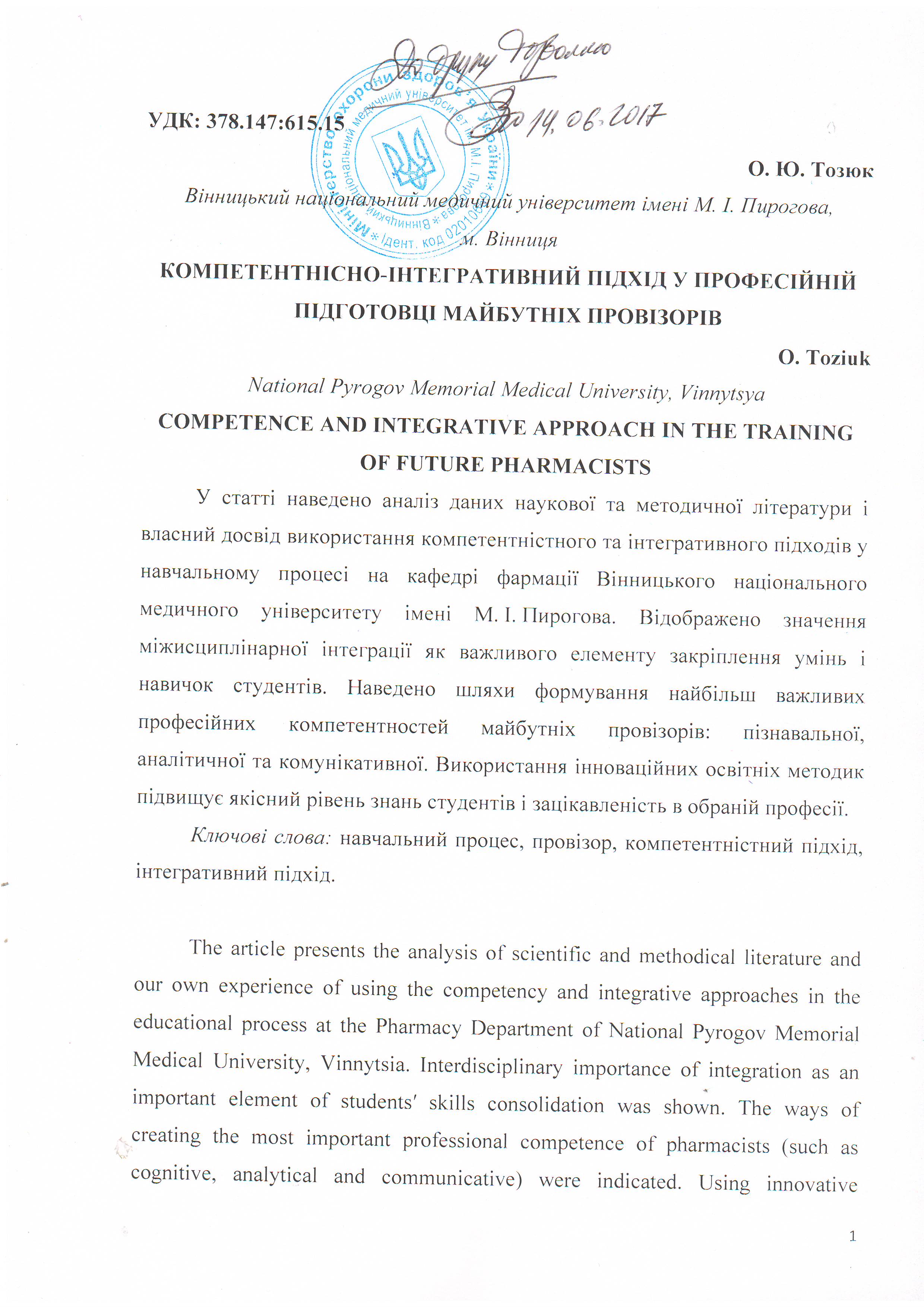 Toziuk, O.Yu. (2015). Kompetentnisnyi pidkhid u fakhovii pidhotovtsi kvalifikovanoho provizora [Competence approach in the professional training of a qualified pharmacist]. Problemy ta perspektyvy vyshchoi medychnoi shkoly u rozrobtsi ta realizatsii natsionalnoi stratehii pobudovy novoi systemy okhorony zdorovia v Ukraini na period 2015–2025 rr., tezy dop. navch.-metod. konf., Vinnytsia [in Ukrainian].