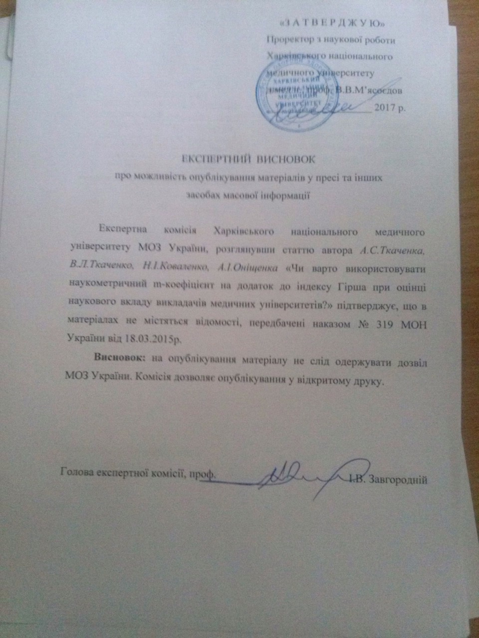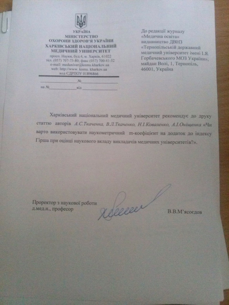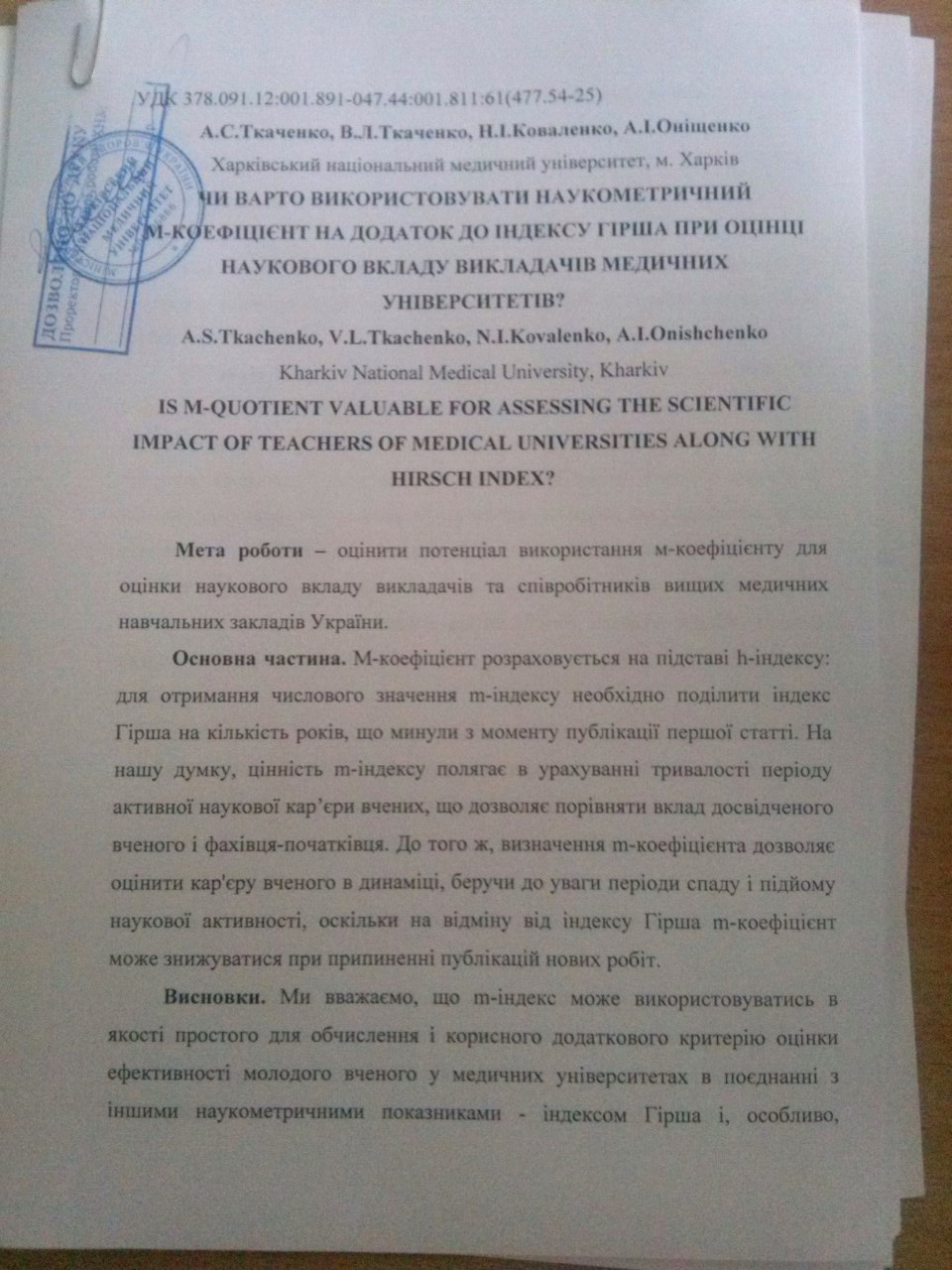Висновок. Ми вважаємо, що m-індекс може використовуватись у якості простого для обчислення і корисного додаткового критерію оцінки ефективності молодого вченого у медичних університетах в поєднанні з іншими наукометричними показниками – індексом Гірша і, особливо, величинами імпакт-факторів журналів, у яких публікується науковий співробітник.