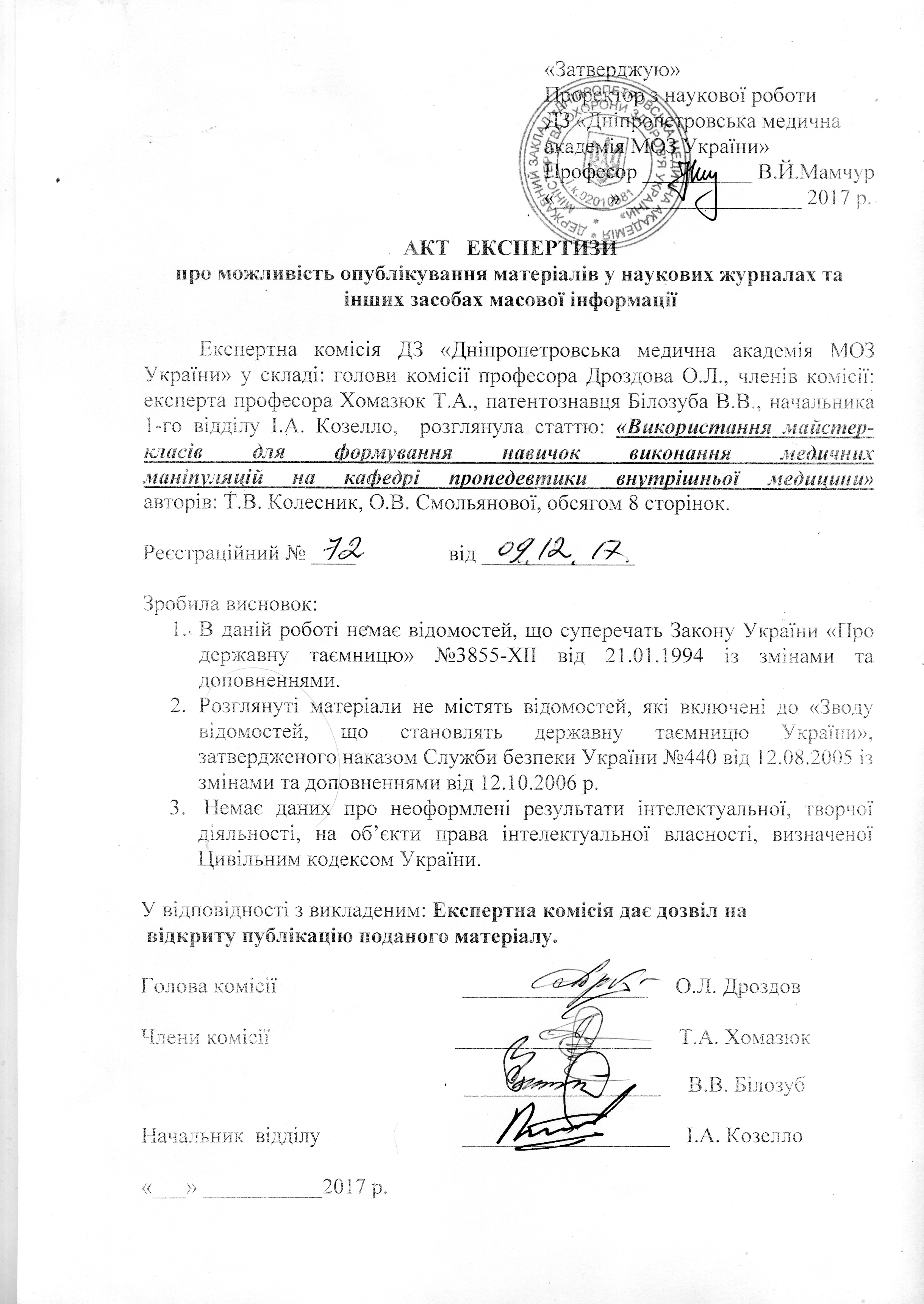 Думанський Ю.В. Контроль ефективності засвоєння практичних навичок випускниками донецького національного медичного університету за спеціальністю «Медицина» / Ю.В. Думанський, П.Г. Кондратенко, М.В Конькова, О.В. Кєтінг // Медична освіта. – 2017. – №3. – C. 46–47.