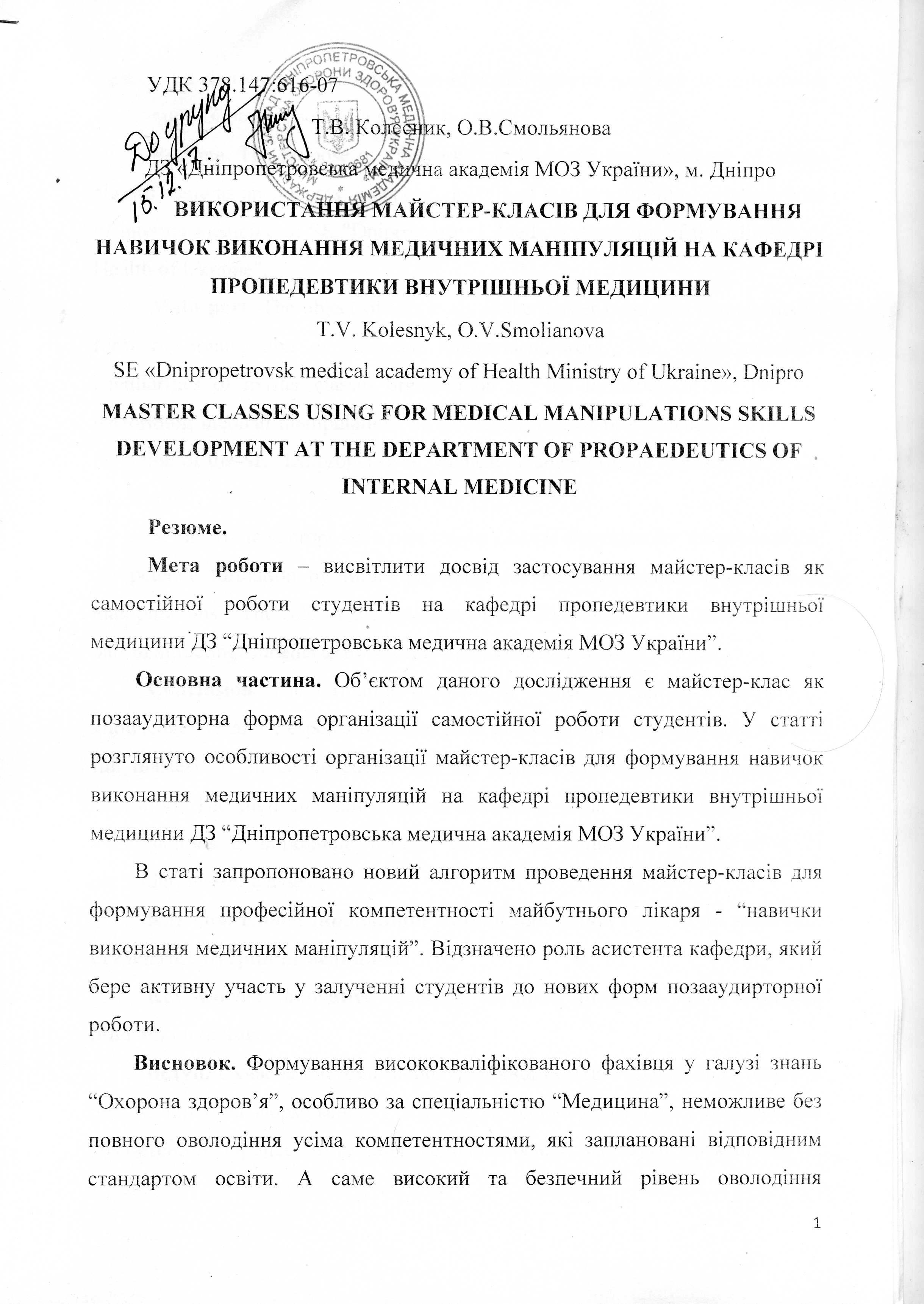 ВИКОРИСТАННЯ МАЙСТЕР-КЛАСІВ ДЛЯ ФОРМУВАННЯ НАВИЧОК ВИКОНАННЯ МЕДИЧНИХ МАНІПУЛЯЦІЙ НА КАФЕДРІ ПРОПЕДЕВТИКИ ВНУТРІШНЬОЇ МЕДИЦИНИ
