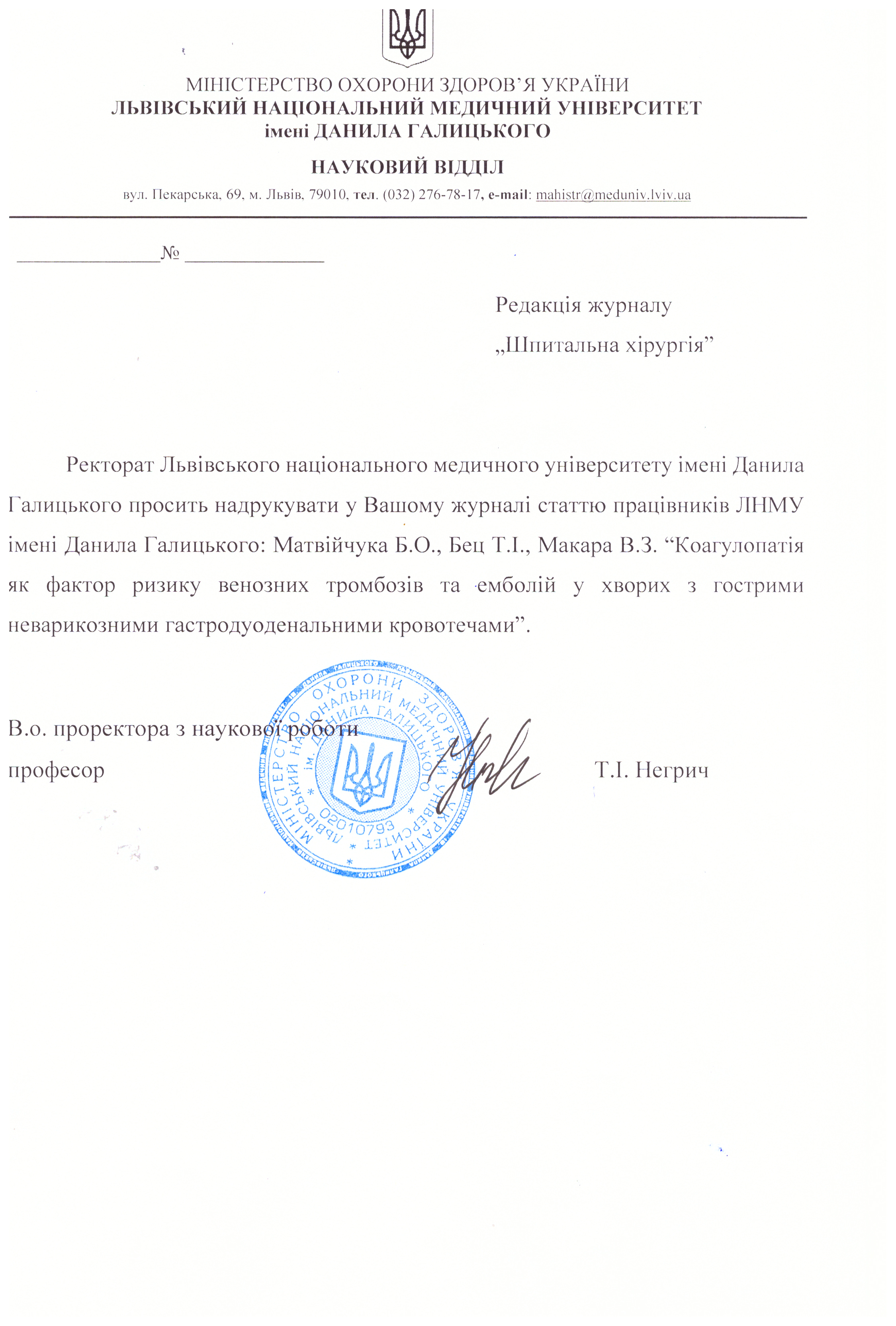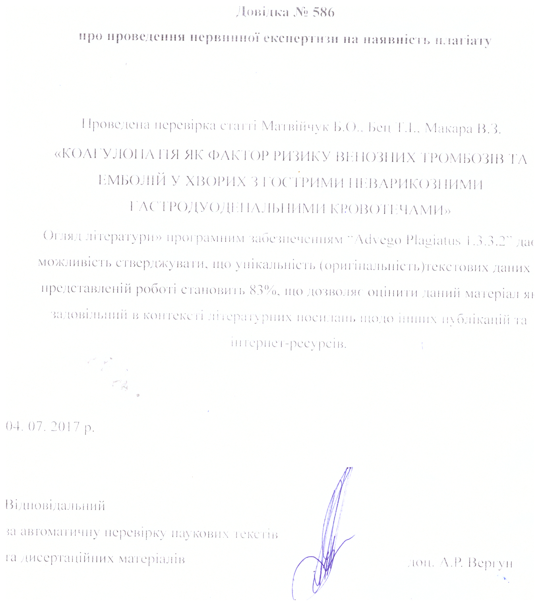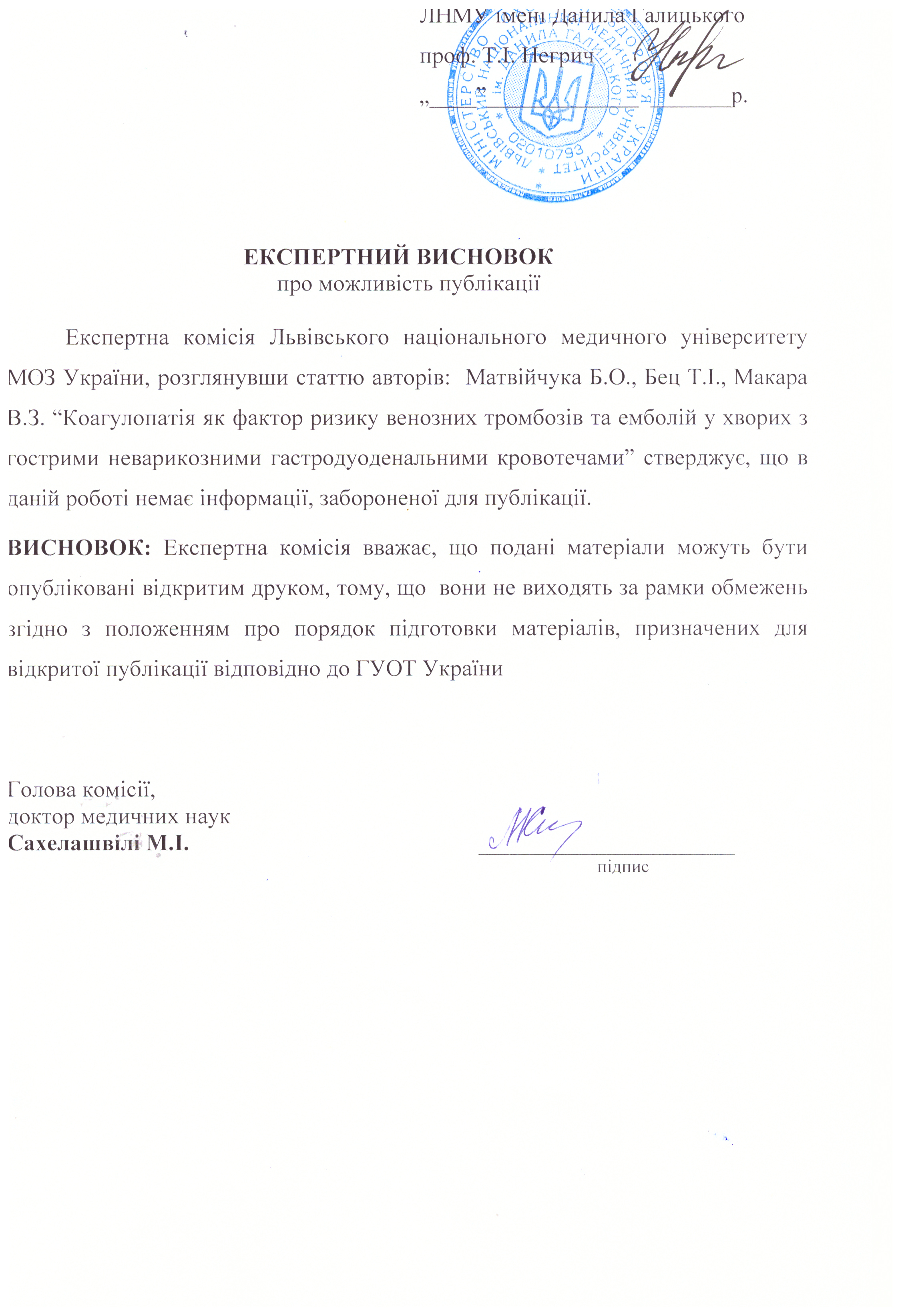 Lavro, Z.Ya., Lapovets, L.Ye., & Akimova, V.M. (2009). Hemostaziolohichni aspekty vyrazkovoi khvoroby shlunka i dvanadtsiatypali kyshky, uskladneni shlunkovo-kyshkovoiu krovotecheiu [Gemostatic aspects of ulcerous illness of stomach and duodenum, complicated the gastroenteric bleeding]. Praktychna medytsyna – Practical Medicine, 1 (15), 82-85 [in Ukrainian].