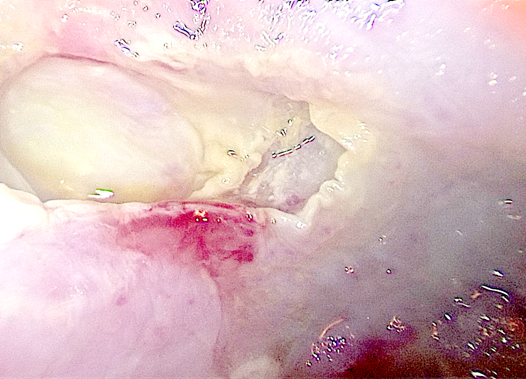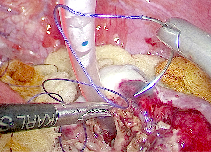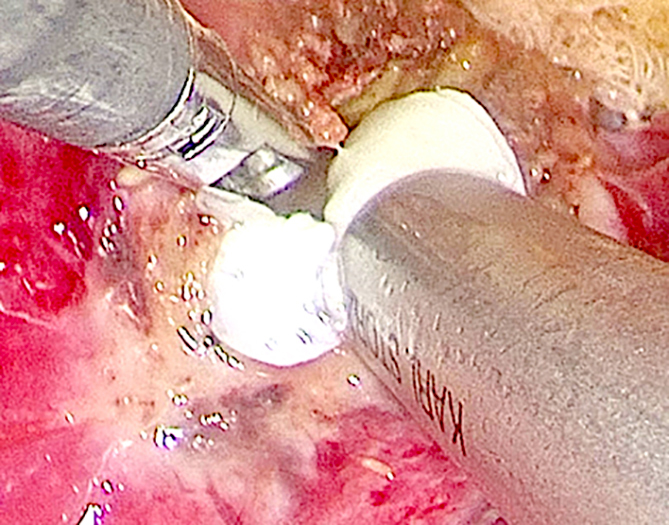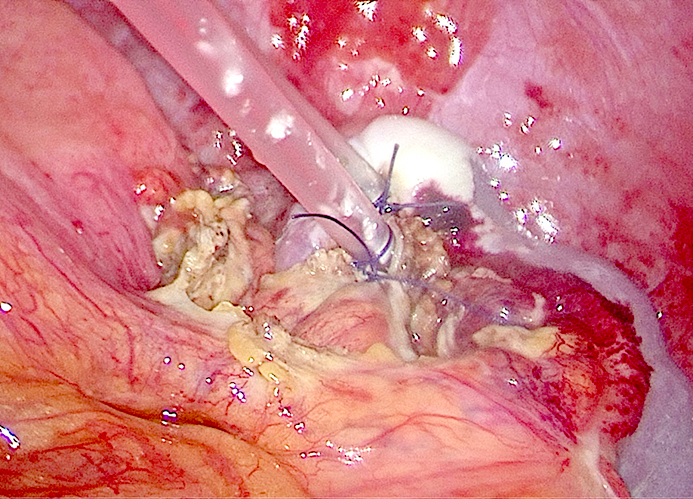 Матеріали та методи. Лапароскопічна ехінококектомія (напівзакритий варіант) виконана пацієнтці 37-ми років з рецидивною ехінококовою кістою діаметром 6 см, локалізованою в верхньому полюсі селезінки і частково інтрапаренхіматозно. Під час операції використовували 4 троакари: два 10 мм і два 5 мм. Після аспірації хітинових оболонок за допомогою 10 мм тубуса відсмоктувача (з високим розрідженням) порожнину дренували двома поліхлорвініловими трубками з герметизацією отвору фіброзної капсули прошиванням.