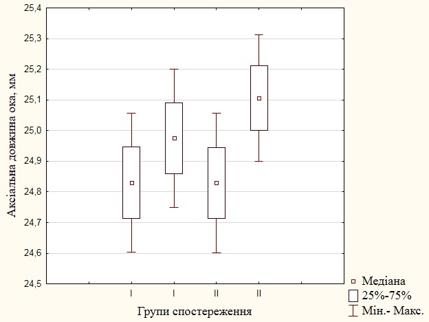 Результати досліджень та їх обговорення. Після лікування у дітей першої групи відбувається підвищення гостроти зору в середньому на 0,15 ум. од. у 82,8 % пацієнтів (58 очей), резервів абсолютної акомодації, запасу відносної акомодації у середньому на 1,5 дптр та 2,5 дптр у 45,7 % пацієнтів (32 очей) (р<0,05). В другій групі, навпаки, визначалося зниження некоригованої гостроти зору на 0,09 ум. од. (р<0,05), показники акомодаційної функції достовірно не змінювалися, залишаючись низькими. В першій групі лише у 17,1 % пацієнтів (12 очей) спостерігалося підвищення клінічної рефракції в середньому на 0,25–0,5 дптр (р>0,05). У другій групі цей показник підвищився в середньому на 0,42 дптр (р<0,05). Збільшення аксіальної довжини ока становило в середньому 0,12 мм в першій групі; 0,22 мм – у другій групі (р<0,05).