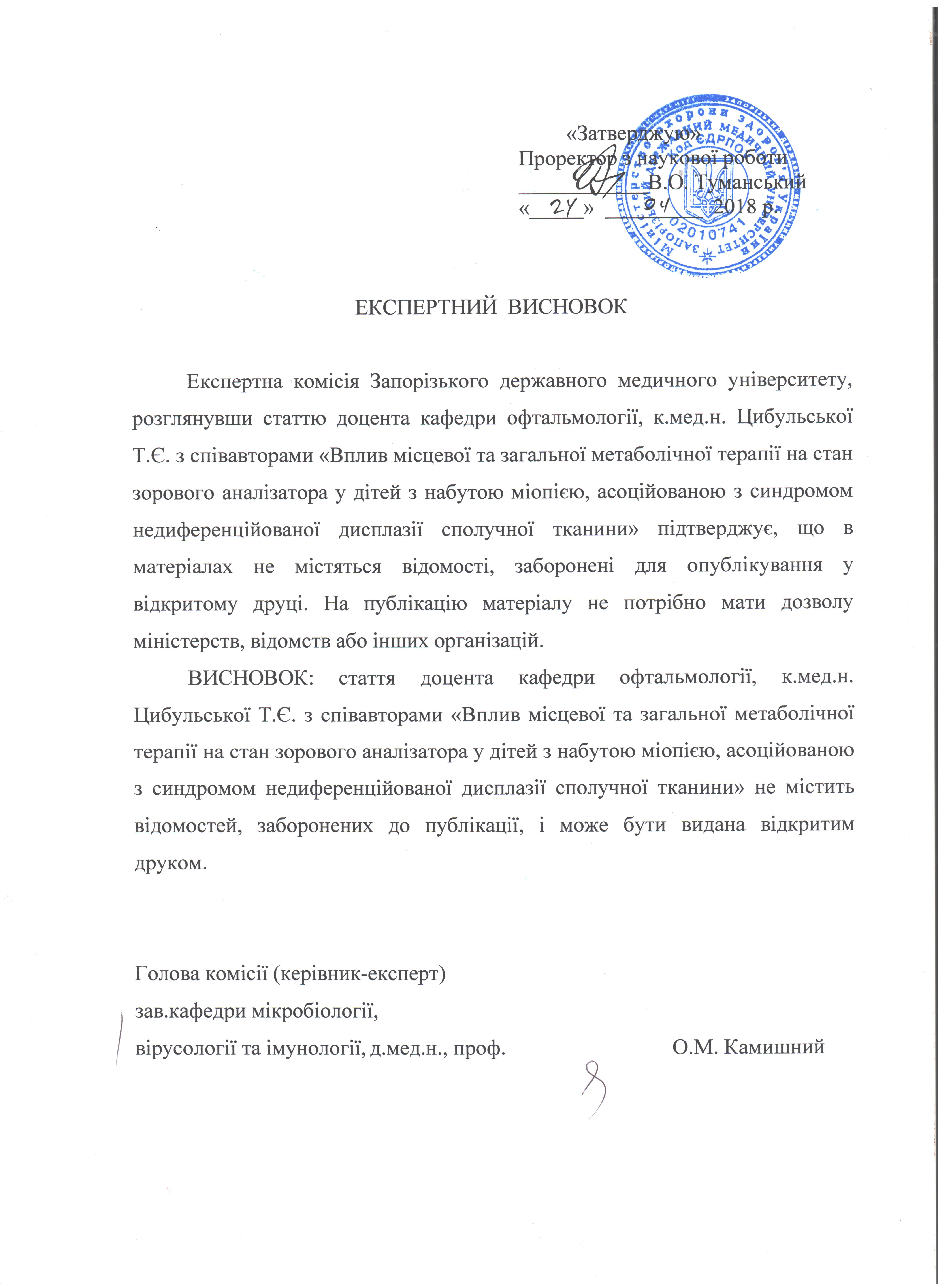 ВПЛИВ МІСЦЕВОЇ ТА ЗАГАЛЬНОЇ МЕТАБОЛІЧНОЇ ТЕРАПІЇ НА СТАН ЗОРОВОГО АНАЛІЗАТОРА В ДІТЕЙ ІЗ НАБУТОЮ МІОПІЄЮ, АСОЦІЙОВАНОЮ З СИНДРОМОМ НЕДИФЕРЕНЦІЙОВАНОЇ ДИСПЛАЗІЇ СПОЛУЧНОЇ ТКАНИНИ