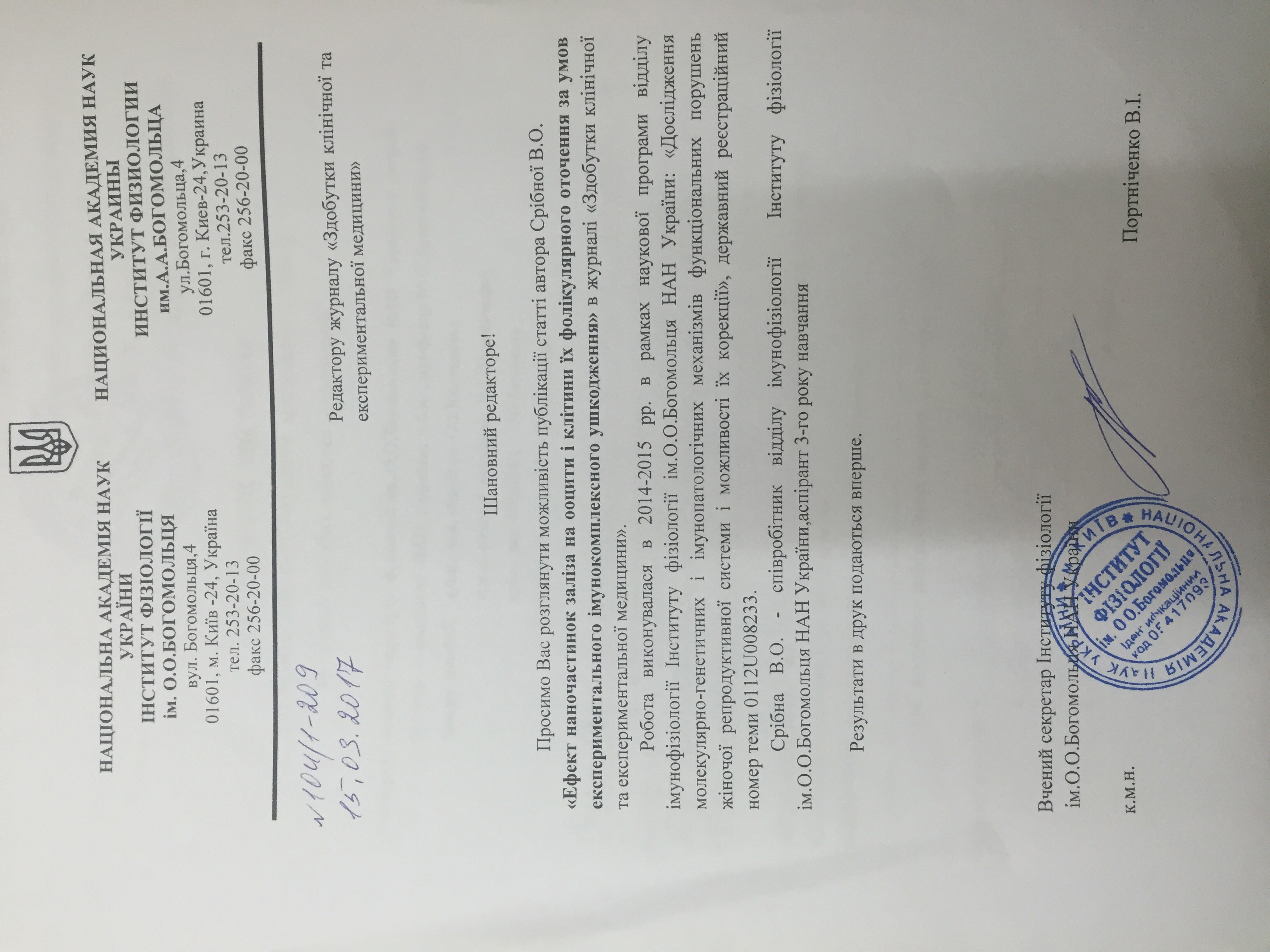 Voznesenska, T.Yu,. Kaleynikova, O.M., Blashkiv, T.V. (2013). Funktsionuvannya orhaniv reproduktyvnoi systemy v umovakh eksperymentalnoho imunnoho ushkodzhennya yayechnyka u myshey [Reproductive system organs functioning in conditions of experimental immune ovarian failure] Visnyk problem biolohii i medytsyny – Journal of Problems of Biology and Medicine, 20, 125-128 [in Ukrainian].